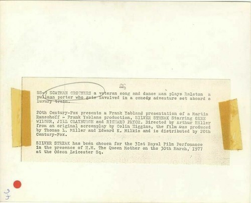 Scatman Crothers train conductor Silver Streak Original 8x10 Photo with paper caption snipe in VG/Near Mint Condition This item is an ORIGINAL 8x10 photo from the historic archives of Silver Screen Mementos. This original photograph was made in the actual year the film, television show or event was produced. The movie studios produced publicity photographs for distribution to the press, photo agencies and publicity departments to advertise the film/tv show or event. Very often original photos have press release information on the reverse of the photo - movie credits, description of the scene, event and people involved. This is a historic piece of cinema art and is being offered from one collector to another, no rights given or implied. Silver Screen are gradually releasing thousands of Original Photographs, Transparencies, Negatives, Lobby Cards, Posters, Magazines and other memorabilia from our historic archive. Powered by Six Bit's e Commerce Solution Listing and template services provided by ink Frog