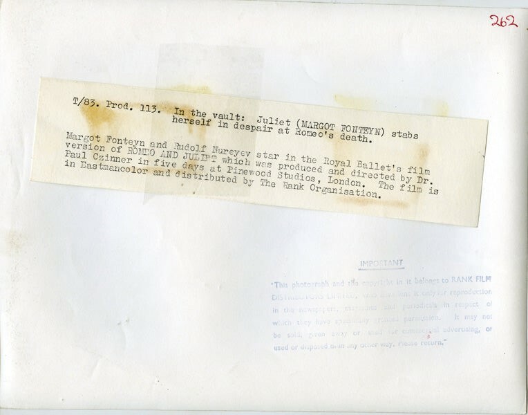 Romeo and Juliet Royal Ballet Margot Fonteyn stabs herself Original Photo 1966 with paper caption snipe stamped in VG/Near Mint Condition This item is an ORIGINAL 8x10 photo from the historic archives of Silver Screen Mementos. This original photograph was made in the actual year the film, television show or event was produced. The movie studios produced publicity photographs for distribution to the press, photo agencies and publicity departments to advertise the film/tv show or event. Very often original photos have press release information on the reverse of the photo - movie credits, description of the scene, event and people involved. This is a historic piece of cinema art and is being offered from one collector to another, no rights given or implied. Silver Screen are gradually releasing thousands of Original Photographs, Transparencies, Negatives, Lobby Cards, Posters, Magazines and other memorabilia from our historic archive.