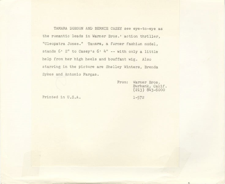 Cleopatra Jones Tamara Dobson Bernie Casey Blaxploitation Original 8x10 Photo with Snipe 1973 VG/Near Mint Condition This item is an ORIGINAL 8x10 photo from the historic archives of Silver Screen Mementos. This original photograph was made in the actual year the film, television show or event was produced. The movie studios produced publicity photographs for distribution to the press, photo agencies and publicity departments to advertise the film/tv show or event. Very often original photos have press release information on the reverse of the photo - movie credits, description of the scene, event and people involved. This is a historic piece of cinema art and is being offered from one collector to another, no rights given or implied. Silver Screen are gradually releasing thousands of Original Photographs, Transparencies, Negatives, Lobby Cards, Posters, Magazines and other memorabilia from our historic archive.