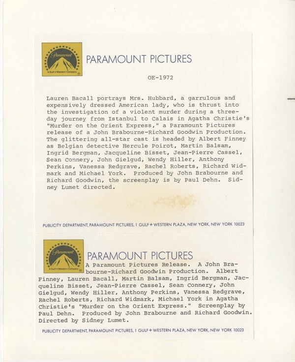 Murder on the Orient Express Lauren Bacall smoking Original 8x10 Photo with Snipe 1974 Near Mint Condition This item is an ORIGINAL 8x10 photo from the historic archives of Silver Screen Mementos. This original photograph was made in the actual year the film, television show or event was produced. The movie studios produced publicity photographs for distribution to the press, photo agencies and publicity departments to advertise the film/tv show or event. Very often original photos have press release information on the reverse of the photo - movie credits, description of the scene, event and people involved. This is a historic piece of cinema art and is being offered from one collector to another, no rights given or implied. Silver Screen are gradually releasing thousands of Original Photographs, Transparencies, Negatives, Lobby Cards, Posters, Magazines and other memorabilia from our historic archive.