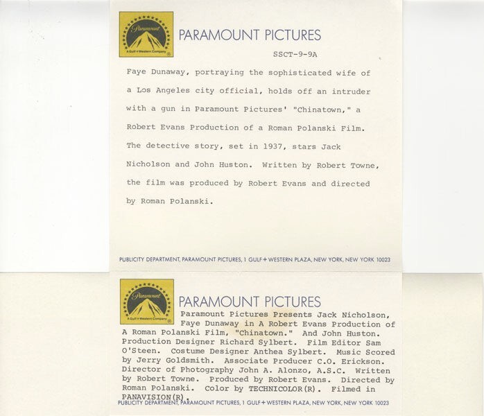 Chinatown 1974 Faye Dunaway with gun Original 8x10 Photo with paper caption snipe - Near Mint This item is an ORIGINAL 8x10 photo from the historic archives of Silver Screen Mementos. This original photograph was made in the actual year the film, television show or event was produced. The movie studios produced publicity photographs for distribution to the press, photo agencies and publicity departments to advertise the film/tv show or event. Very often original photos have press release information on the reverse of the photo - movie credits, description of the scene, event and people involved. This is a historic piece of cinema art and is being offered from one collector to another, no rights given or implied. Silver Screen are gradually releasing thousands of Original Photographs, Transparencies, Negatives, Lobby Cards, Posters, Magazines and other memorabilia from our historic archive.
