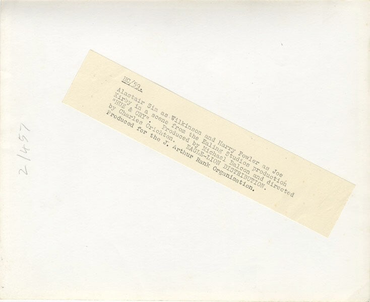 Hue and Cry 1947 Ealing Comedy Alastair Sim Harry Fowler Original 8x10 Photo with paper caption snipe VG/Near Mint Condition This item is an ORIGINAL 8x10 photo from the historic archives of Silver Screen Mementos. This original photograph was made in the actual year the film, television show or event was produced. The movie studios produced publicity photographs for distribution to the press, photo agencies and publicity departments to advertise the film/tv show or event. Very often original photos have press release information on the reverse of the photo - movie credits, description of the scene, event and people involved. This is a historic piece of cinema art and is being offered from one collector to another, no rights given or implied. Silver Screen are gradually releasing thousands of Original Photographs, Transparencies, Negatives, Lobby Cards, Posters, Magazines and other memorabilia from our historic archive.