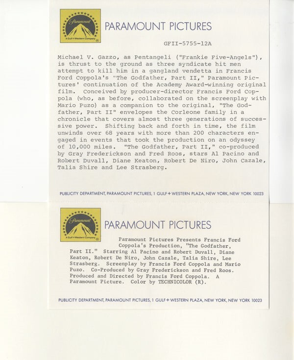 The Godfather Part 2 Michael V Gazzo Vendetta Scene Original 8x10 Photo with Snipe 1974 Near Mint Condition This item is an ORIGINAL 8x10 photo from the historic archives of Silver Screen Mementos. This original photograph was made in the actual year the film, television show or event was produced. The movie studios produced publicity photographs for distribution to the press, photo agencies and publicity departments to advertise the film/tv show or event. Very often original photos have press release information on the reverse of the photo - movie credits, description of the scene, event and people involved. This is a historic piece of cinema art and is being offered from one collector to another, no rights given or implied. Silver Screen are gradually releasing thousands of Original Photographs, Transparencies, Negatives, Lobby Cards, Posters, Magazines and other memorabilia from our historic archive.