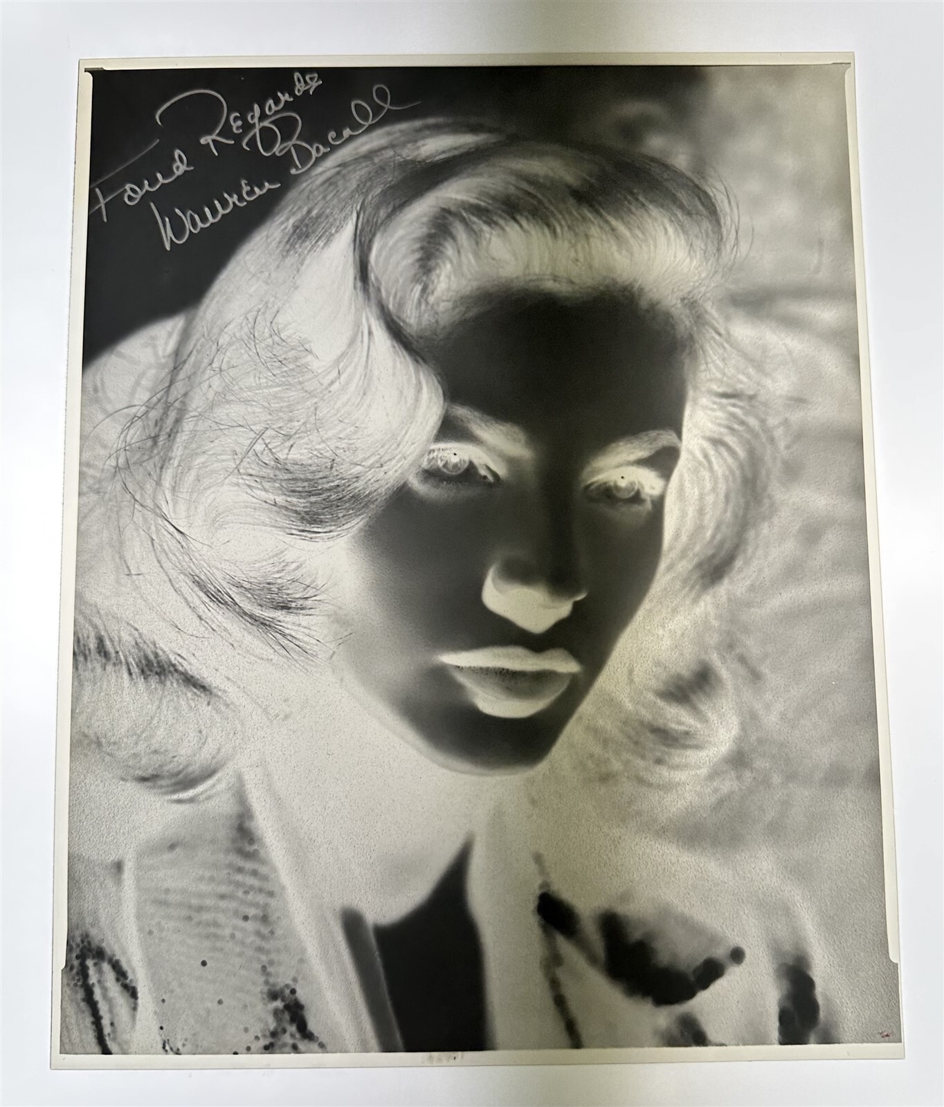 Lauren Bacall Breathtaking Facsimile Autograph Signed Vintage 8x10 Negative - A smouldering 1940's portrait of the legendary star that contains a facsimile autograph in top left corner. This vintage studio duplicate 8x10 inch negative was likely used for creating 8x10 prints for fans or for publication in movie magazine from that era. This is a vintage studio or photographer's 8x10 inch black and white photographic negative from our historic archive. This vintage duplicate negative was created from the original camera negative by the studio or photographer in order to make prints and use for publications. This is a real collector's item and would make superb quality photographs or prints. This would also be a great addition to any collection or image archive. This black and white photographic negative is in Excellent condition. This collector's item is being sold from one collector to another, no rights are given or implied. Silver Screen Mementos are gradually releasing from their vast archives thousands of original photographs, transparencies, negatives, slides, lobby cards and other movie or television memorabilia.