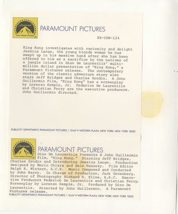 King Kong Jessica Lange Held in Giant Apes Hand Original 8x10 Photo with Snipe 1976 Near Mint Condition This item is an ORIGINAL 8x10 photo from the historic archives of Silver Screen Mementos. This original photograph was made in the actual year the film, television show or event was produced. The movie studios produced publicity photographs for distribution to the press, photo agencies and publicity departments to advertise the film/tv show or event. Very often original photos have press release information on the reverse of the photo - movie credits, description of the scene, event and people involved. This is a historic piece of cinema art and is being offered from one collector to another, no rights given or implied. Silver Screen are gradually releasing thousands of Original Photographs, Transparencies, Negatives, Lobby Cards, Posters, Magazines and other memorabilia from our historic archive.