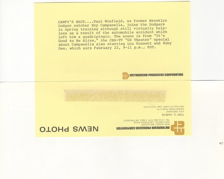 It's Good To Be Alive Paul Winfield Original 8x10 Photo Roy Campanella story with paper caption snipe - Near Mint Condition This item is an ORIGINAL 8x10 photo from the historic archives of Silver Screen Mementos. This original photograph was made in the actual year the film, television show or event was produced. The movie studios produced publicity photographs for distribution to the press, photo agencies and publicity departments to advertise the film/tv show or event. Very often original photos have press release information on the reverse of the photo - movie credits, description of the scene, event and people involved. This is a historic piece of cinema art and is being offered from one collector to another, no rights given or implied. Silver Screen are gradually releasing thousands of Original Photographs, Transparencies, Negatives, Lobby Cards, Posters, Magazines and other memorabilia from our historic archive.