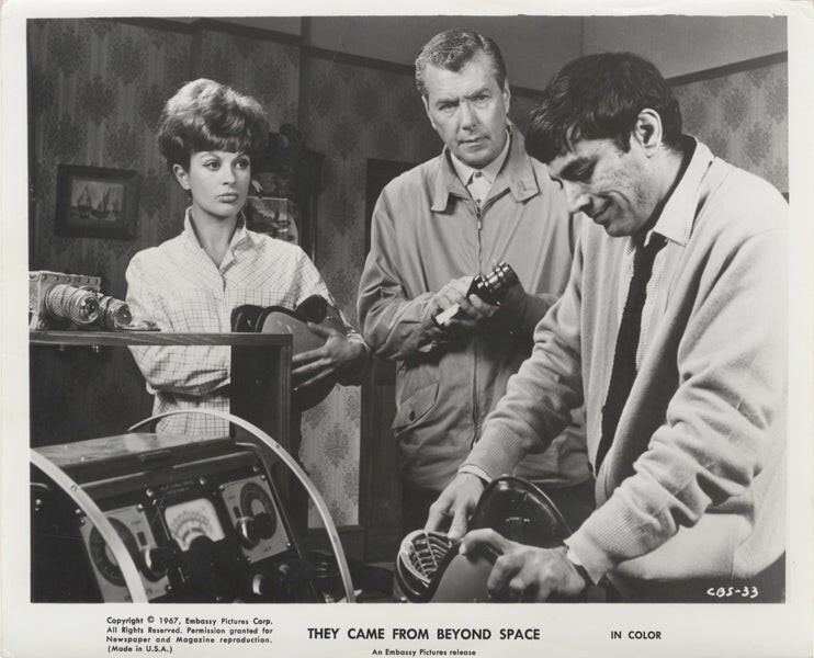 They Came From Beyond Space Robert Hutton Jennifer Jayne Cult Sci Fi Original 8x10 Photo 1967 Good/VG Condition (creases at corners) This item is an ORIGINAL 8x10 photo from the historic archives of Silver Screen Mementos. This original photograph was made in the actual year the film, television show or event was produced. The movie studios produced publicity photographs for distribution to the press, photo agencies and publicity departments to advertise the film/tv show or event. Very often original photos have press release information on the reverse of the photo - movie credits, description of the scene, event and people involved. This is a historic piece of cinema art and is being offered from one collector to another, no rights given or implied. Silver Screen are gradually releasing thousands of Original Photographs, Transparencies, Negatives, Lobby Cards, Posters, Magazines and other memorabilia from our historic archive.