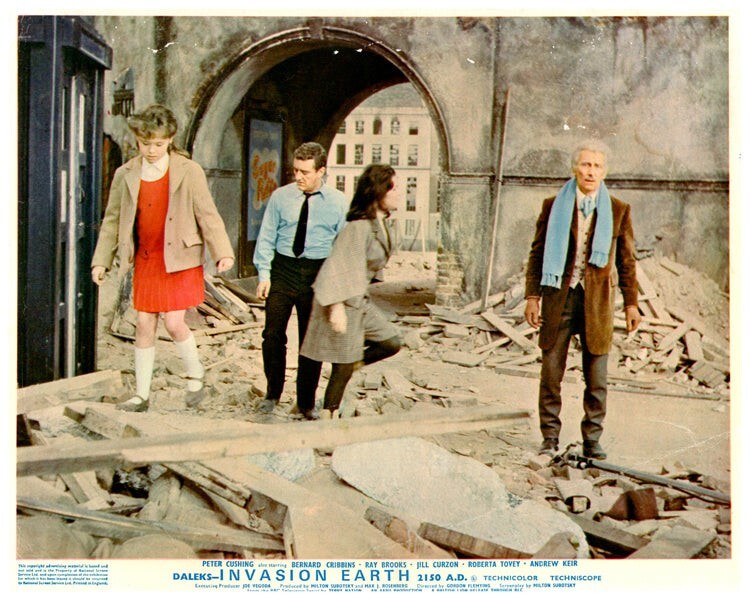 Daleks Invasion Earth 2150 A.D. 1966 Dr. Who movie rare Original Lobby Card - This is an original 1966 British front of house lobby card from the Dr. Who theatrical release film starring Peter Cushing, Bernard Cribbins, Ray Brooks , Jill Curzon and Roberta Tovey. Good Condition (light crease across card, no pin holes, no tape, no tears)) Silver Screen Mementos are pleased to be able to offer this authentic original Lobby Card measuring 8x10 inches. This lobby card is from Great Britain and was printed during the actual year the film was released in movie theaters. The lobby card (also known as Front of House/ FOH card in the UK) was created by the film studios to publicize the movie and was intended for display outside the movie theatre in special glass display boxes. These are NOT reproductions! You are looking at a truly original piece of cinema art, a genuine collector's item. We have a huge archive of over 250,000 original lobby cards, mostly from the 1930's to the 1980's. We will be releasing many more rare gems from our vast collection, which will include lobby cards, original photographs, movie stills, magazines, brochures negatives, transparencies, slides and other collectible items of movie memorabilia.
