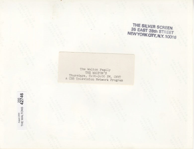 The Waltons Judy Norton, Ralph Waite, Kami Cotler, Ellen Corby, David W. Harper, Mary Beth Mc Donough, Eric Scott, Jon Walmsley Family Cast Original 7x9 Photo with Snipe Near Mint Condition This item is an ORIGINAL 8x10 photo from the historic archives of Silver Screen Mementos. This original photograph was made in the actual year the film, television show or event was produced. The movie studios produced publicity photographs for distribution to the press, photo agencies and publicity departments to advertise the film/tv show or event. Very often original photos have press release information on the reverse of the photo - movie credits, description of the scene, event and people involved. This is a historic piece of cinema art and is being offered from one collector to another, no rights given or implied. Silver Screen are gradually releasing thousands of Original Photographs, Transparencies, Negatives, Lobby Cards, Posters, Magazines and other memorabilia from our historic archive.