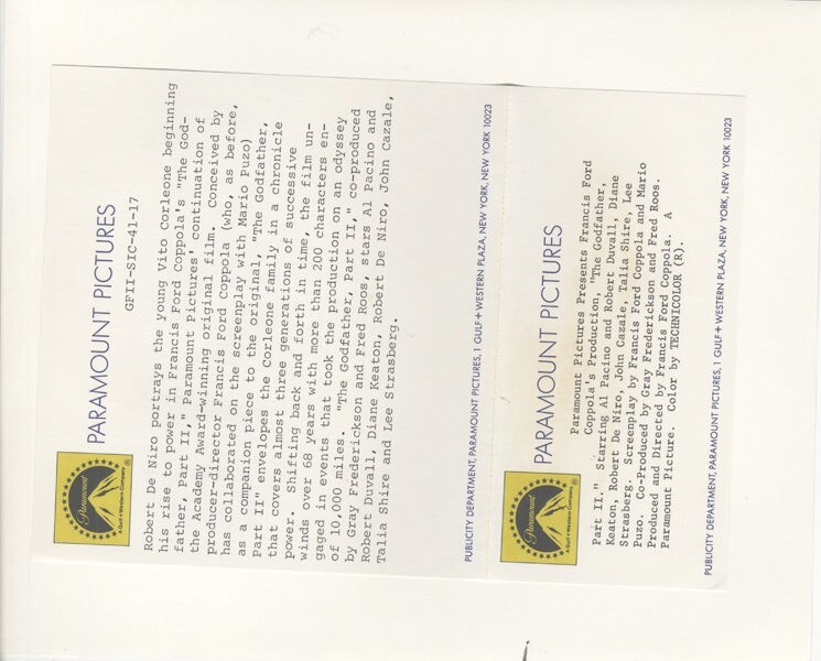 The Godfather 2 Robert De Niro Vito Corleone Original 8x10 Photo Snipe 1974, very rare iconic image - Near Mint Condition This item is an ORIGINAL 8x10 photo from the historic archives of Silver Screen Mementos. This original photograph was made in the actual year the film, television show or event was produced. The movie studios produced publicity photographs for distribution to the press, photo agencies and publicity departments to advertise the film/tv show or event. Very often original photos have press release information on the reverse of the photo - movie credits, description of the scene, event and people involved. This is a historic piece of cinema art and is being offered from one collector to another, no rights given or implied. Silver Screen are gradually releasing thousands of Original Photographs, Transparencies, Negatives, Lobby Cards, Posters, Magazines and other memorabilia from our historic archive.