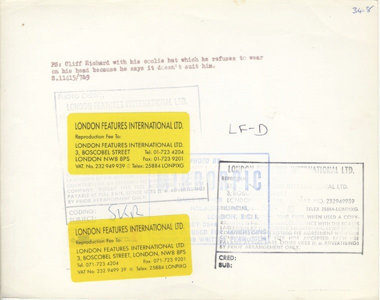 Cliff Richard holding Coolie Hat 1960's Stamped original 8x10 Photo - VG/Near Mint This is an Original vintage photograph from the year of the concert, photo shoot or event measuring approximately 8x10 inches (20x25 cm) unless otherwise stated. Many Original vintage photographs carry the agency or photographer stamp on the back. This is a rare collectors item being offered from one collector to another, no nights given or implied. Silver Screen are gradually releasing thousands of Original Photographs, Transparencies, Negatives, Lobby Cards, Posters, Magazines and other memorabilia from our historic archive.