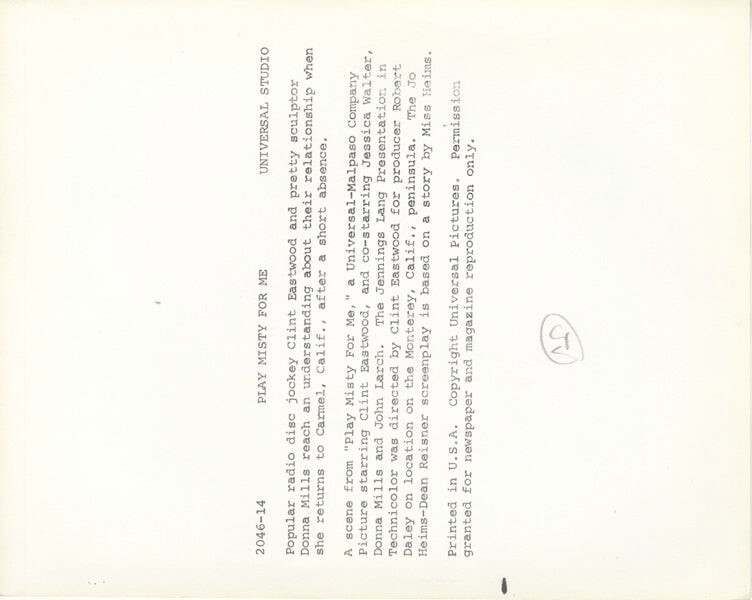 Play Misty for Me 1971 Clint Eastwood, Donna Mills Close up Scene Original 7x9 approx Photo with Snipe VG/Near Mint Condition This item is an ORIGINAL 8x10 photo from the historic archives of Silver Screen Mementos. This original photograph was made in the actual year the film, television show or event was produced. The movie studios produced publicity photographs for distribution to the press, photo agencies and publicity departments to advertise the film/tv show or event. Very often original photos have press release information on the reverse of the photo - movie credits, description of the scene, event and people involved. This is a historic piece of cinema art and is being offered from one collector to another, no rights given or implied. Silver Screen are gradually releasing thousands of Original Photographs, Transparencies, Negatives, Lobby Cards, Posters, Magazines and other memorabilia from our historic archive.