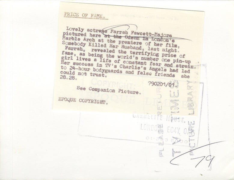 Farrah Fawcett 1978 Candid Somebody Killed Her Husband Movie Premiere Glamour Original 6x8 Photo Stamped with Snipe VG/Near Mint Condition This item is an ORIGINAL 8x10 photo from the historic archives of Silver Screen Mementos. This original photograph was made in the actual year the film, television show or event was produced. The movie studios produced publicity photographs for distribution to the press, photo agencies and publicity departments to advertise the film/tv show or event. Very often original photos have press release information on the reverse of the photo - movie credits, description of the scene, event and people involved. This is a historic piece of cinema art and is being offered from one collector to another, no rights given or implied. Silver Screen are gradually releasing thousands of Original Photographs, Transparencies, Negatives, Lobby Cards, Posters, Magazines and other memorabilia from our historic archive.