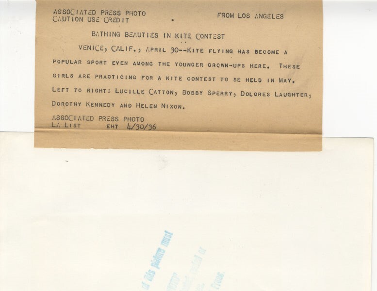 Venice Beach 1936 Bathing Beauties Lucille Catton, Bobby Sperry, Dolores Laughter, Dorothy Kennedy, Helen Nixon flying kites on the beach Original 7x9 Photo Stamped with AP Snipe VG/Near Mint Condition This item is an ORIGINAL 8x10 photo from the historic archives of Silver Screen Mementos. This original photograph was made in the actual year the film, television show or event was produced. The movie studios produced publicity photographs for distribution to the press, photo agencies and publicity departments to advertise the film/tv show or event. Very often original photos have press release information on the reverse of the photo - movie credits, description of the scene, event and people involved. This is a historic piece of cinema art and is being offered from one collector to another, no rights given or implied. Silver Screen are gradually releasing thousands of Original Photographs, Transparencies, Negatives, Lobby Cards, Posters, Magazines and other memorabilia from our historic archive.