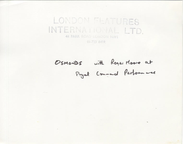 The Osmonds, Donny Osmond with Roger Moore 1970's Royal London Command Performance Original 6x8 approx Photo Stamped VG/Near Mint Condition This is an Original vintage photograph from the year of the concert, photo shoot or event measuring approximately 8x10 inches (20x25 cm) unless otherwise stated. Many Original vintage photographs carry the agency or photographer stamp on the back. This is a rare collectors item being offered from one collector to another, no nights given or implied. Silver Screen are gradually releasing thousands of Original Photographs, Transparencies, Negatives, Lobby Cards, Posters, Magazines and other memorabilia from our historic archive.