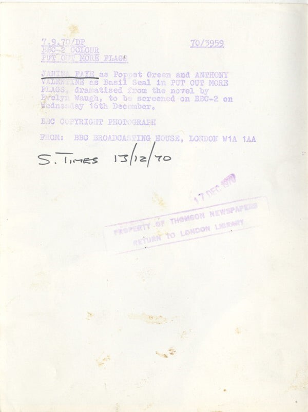 Put Out More Flags Janina Faye, Anthony Valentine Original 7x9 approx Photo Stamped with Snipe 1970 VG/Near Mint Condition This item is an ORIGINAL 8x10 photo from the historic archives of Silver Screen Mementos. This original photograph was made in the actual year the film, television show or event was produced. The movie studios produced publicity photographs for distribution to the press, photo agencies and publicity departments to advertise the film/tv show or event. Very often original photos have press release information on the reverse of the photo - movie credits, description of the scene, event and people involved. This is a historic piece of cinema art and is being offered from one collector to another, no rights given or implied. Silver Screen are gradually releasing thousands of Original Photographs, Transparencies, Negatives, Lobby Cards, Posters, Magazines and other memorabilia from our historic archive.