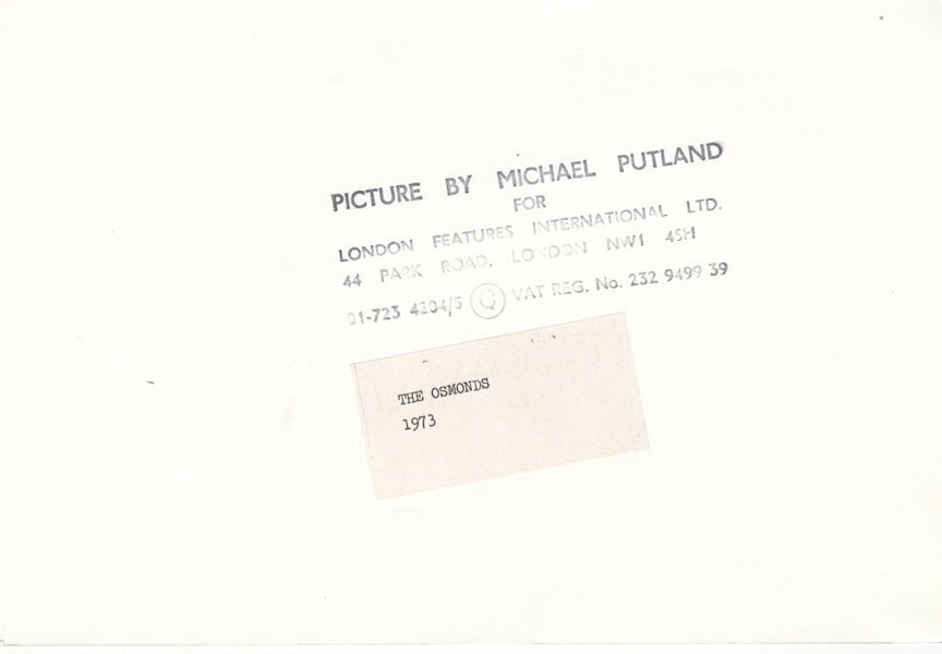 The Osmonds Donny Osmond, Marie Osmond 1973 Pop Group Portrait Original 7x9 Photo Stamped with Snipe VG/Near Mint Condition This is an Original vintage photograph from the year of the concert, photo shoot or event measuring approximately 8x10 inches (20x25 cm) unless otherwise stated. Many Original vintage photographs carry the agency or photographer stamp on the back. This is a rare collectors item being offered from one collector to another, no nights given or implied. Silver Screen are gradually releasing thousands of Original Photographs, Transparencies, Negatives, Lobby Cards, Posters, Magazines and other memorabilia from our historic archive.