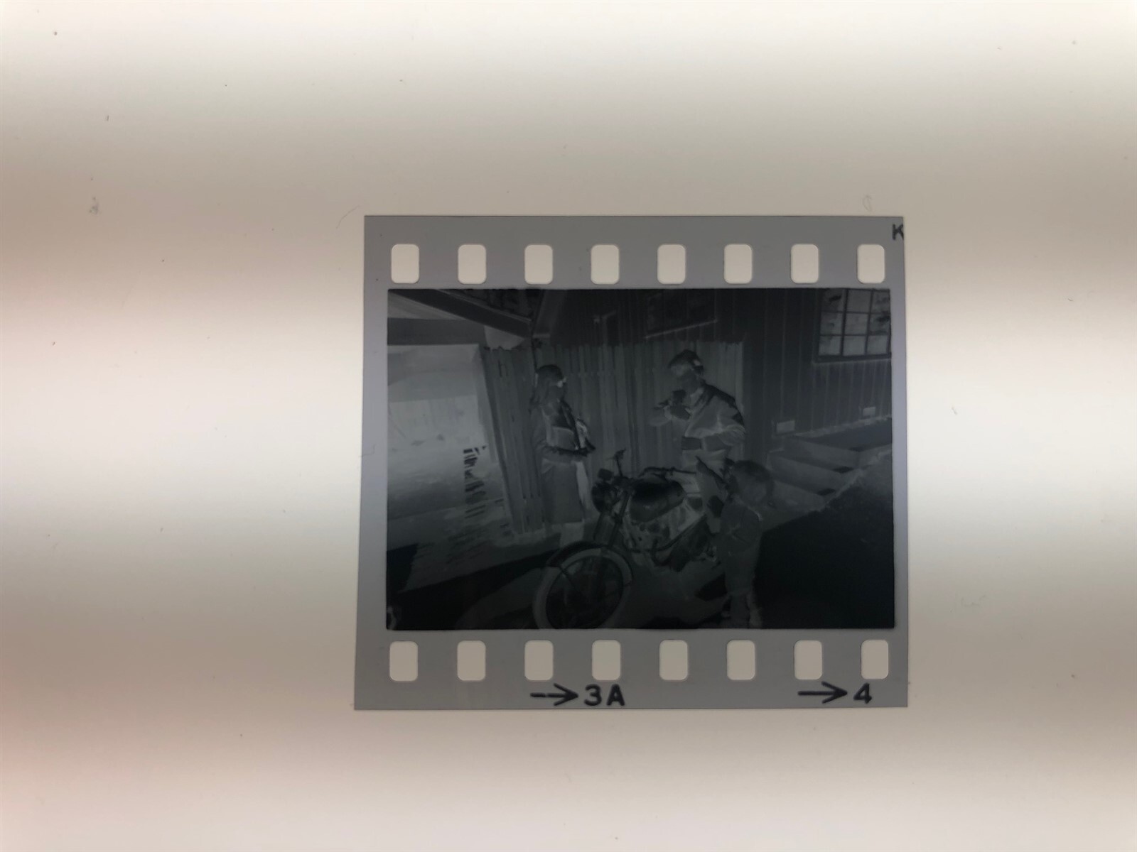 Clint Eastwood Motorbike wife Maggie Kyle Camera Original 35mm Photo Negative - An extremely rare on of a kind original 35mm camera negative of Clint Eastwood on his motorbike as wife Maggie and son Kyle stand beside him circa 1970. This is an original 35mm B/W Camera Negative taken by the actual photographer on set or at the event. This is a one of a kind real collectors item, the unique actual negative that was in the camera when the photographer captured this moment. The negative can be scanned or used to create a high quality photograph. This collector's item is being sold from one collector to another, no rights are given or implied. Silver Screen Mementos are gradually releasing from their vast archives thousands of original photographs, transparencies, negatives, slides, lobby cards and other movie or television memorabilia.