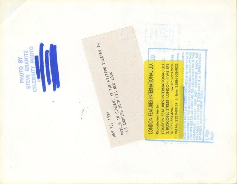 Prince barechested arms raised at 1986 concert at Wiltern Theater Lost Angeles Original 7x9 Type 1 Photo Stamped with Snipe VG/Near Mint Condition This is an Original vintage photograph from the year of the concert, photo shoot or event measuring approximately 8x10 inches (20x25 cm) unless otherwise stated. Many Original vintage photographs carry the agency or photographer stamp on the back. This is a rare collectors item being offered from one collector to another, no nights given or implied. Silver Screen are gradually releasing thousands of Original Photographs, Transparencies, Negatives, Lobby Cards, Posters, Magazines and other memorabilia from our historic archive.
