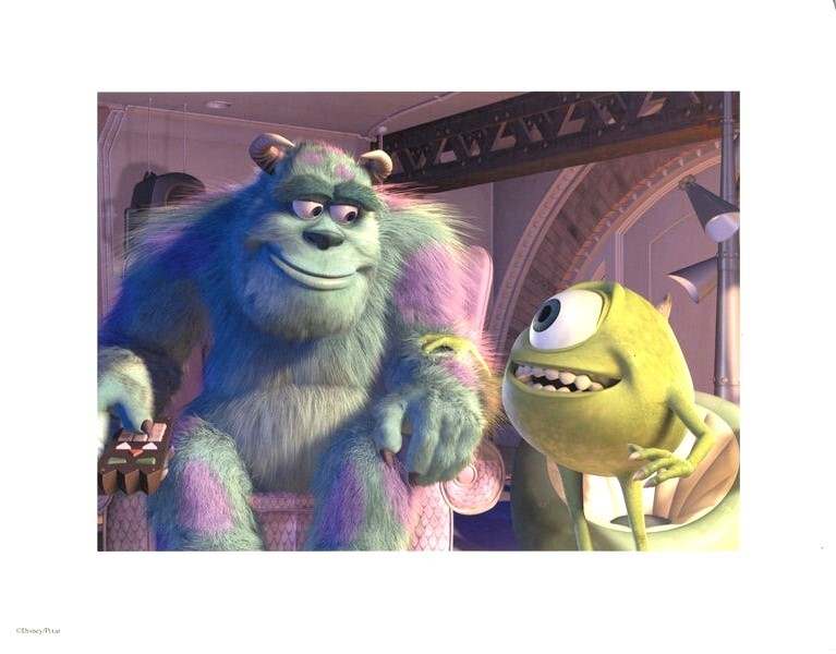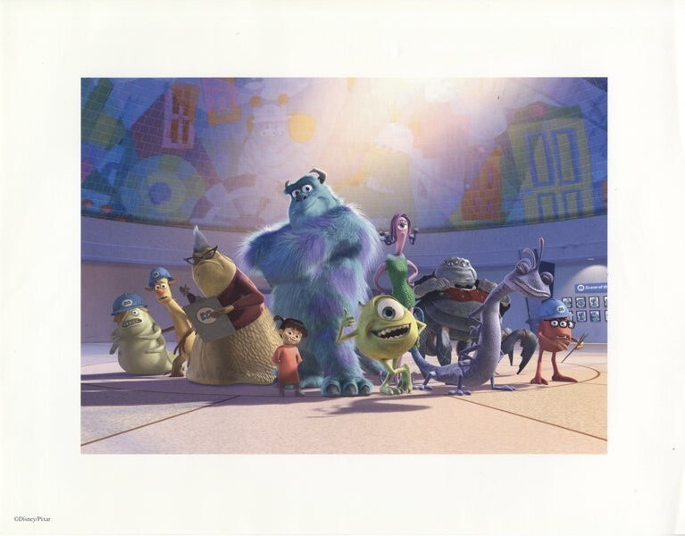 Monsters Inc Walt Disney Animation 2001 11x14 Lithographs Prints Folder Foldout - A rare large thick card folder that opens out and contains four 11x14 inch vibrant color lithograph prints from the classic Walt Disney animated film. We are gradually releasing from our historic archives original photographs, negatives, transparency, slides, movie posters, magazines, books, press books, pins, autographs, trading cards, press badges and other rare collectors items.