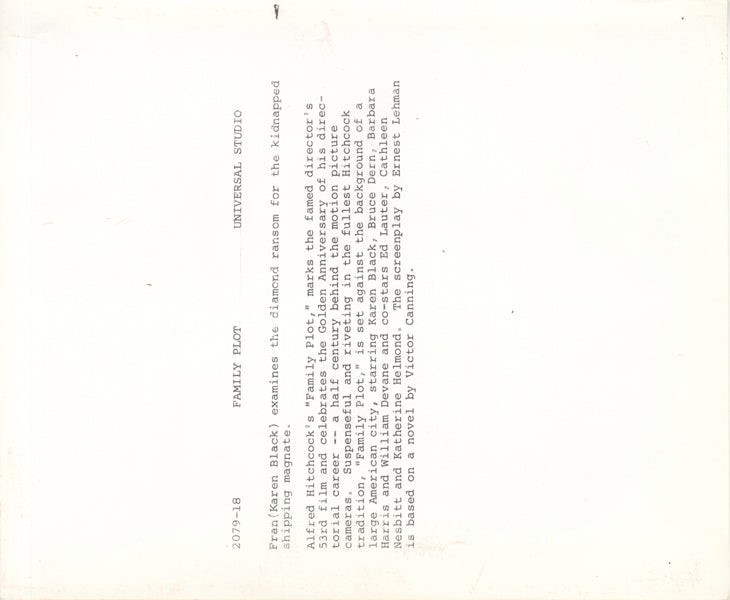 Karen Black Family Plot 1976 Original 8x10 Photo Alfred Hitchcock with Snipe Near Mint Condition This item is an ORIGINAL 8x10 photo from the historic archives of Silver Screen Mementos. This original photograph was made in the actual year the film, television show or event was produced. The movie studios produced publicity photographs for distribution to the press, photo agencies and publicity departments to advertise the film/tv show or event. Very often original photos have press release information on the reverse of the photo - movie credits, description of the scene, event and people involved. This is a historic piece of cinema art and is being offered from one collector to another, no rights given or implied. Silver Screen are gradually releasing thousands of Original Photographs, Transparencies, Negatives, Lobby Cards, Posters, Magazines and other memorabilia from our historic archive.
