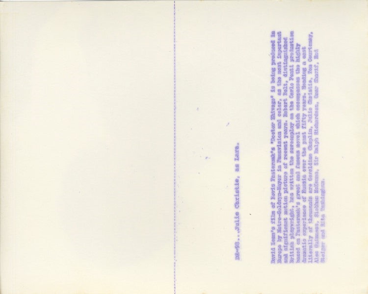 Julie Christie Doctor Dr. Zhivago 1965 Original 8x10 Photo snipe in Russian hat - VG Condition (some show through from snipe) This item is an ORIGINAL 8x10 photo from the historic archives of Silver Screen Mementos. This original photograph was made in the actual year the film, television show or event was produced. The movie studios produced publicity photographs for distribution to the press, photo agencies and publicity departments to advertise the film/tv show or event. Very often original photos have press release information on the reverse of the photo - movie credits, description of the scene, event and people involved. This is a historic piece of cinema art and is being offered from one collector to another, no rights given or implied. Silver Screen are gradually releasing thousands of Original Photographs, Transparencies, Negatives, Lobby Cards, Posters, Magazines and other memorabilia from our historic archive.