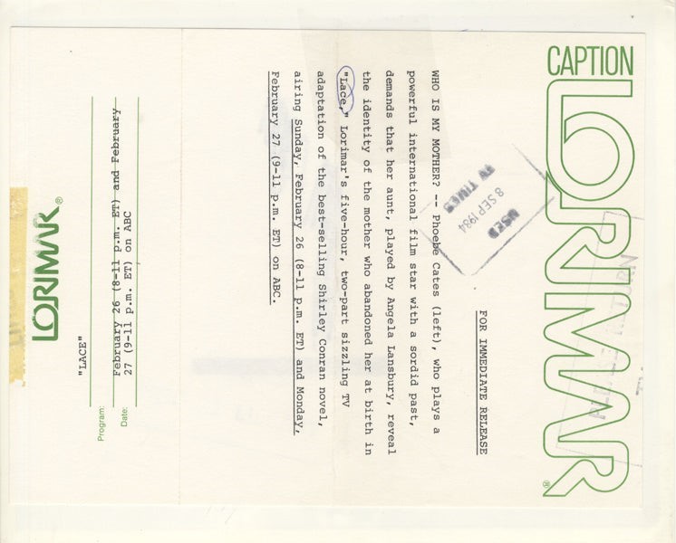 Lace Phoebe Cates, Angela Lansbury Original 8x10 Photo Stamped with Snipe 1984 Near Mint Condition This item is an ORIGINAL 8x10 photo from the historic archives of Silver Screen Mementos. This original photograph was made in the actual year the film, television show or event was produced. The movie studios produced publicity photographs for distribution to the press, photo agencies and publicity departments to advertise the film/tv show or event. Very often original photos have press release information on the reverse of the photo - movie credits, description of the scene, event and people involved. This is a historic piece of cinema art and is being offered from one collector to another, no rights given or implied. Silver Screen are gradually releasing thousands of Original Photographs, Transparencies, Negatives, Lobby Cards, Posters, Magazines and other memorabilia from our historic archive.