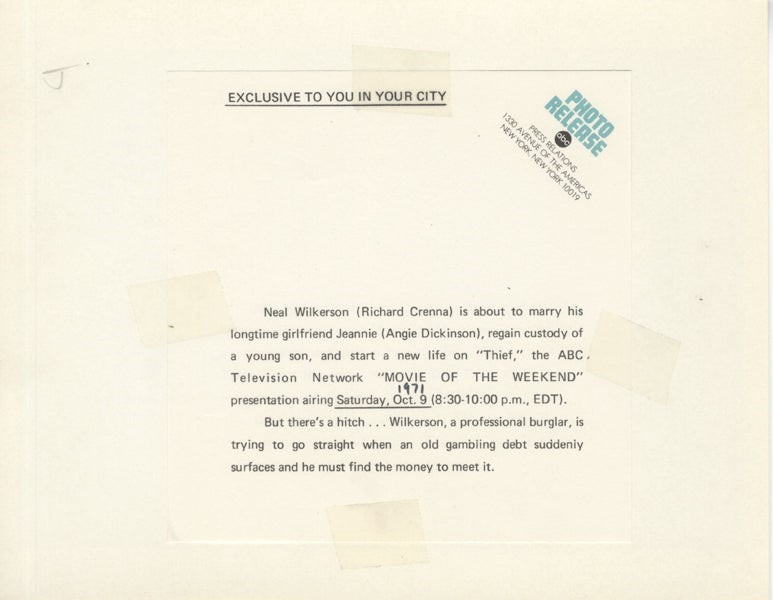 Angie Dickinson, Richard Crenna Thief 1971 TV Movie Original 7x9 Photo with ABC Snipe Near Mint Condition This item is an ORIGINAL 8x10 photo from the historic archives of Silver Screen Mementos. This original photograph was made in the actual year the film, television show or event was produced. The movie studios produced publicity photographs for distribution to the press, photo agencies and publicity departments to advertise the film/tv show or event. Very often original photos have press release information on the reverse of the photo - movie credits, description of the scene, event and people involved. This is a historic piece of cinema art and is being offered from one collector to another, no rights given or implied. Silver Screen are gradually releasing thousands of Original Photographs, Transparencies, Negatives, Lobby Cards, Posters, Magazines and other memorabilia from our historic archive.