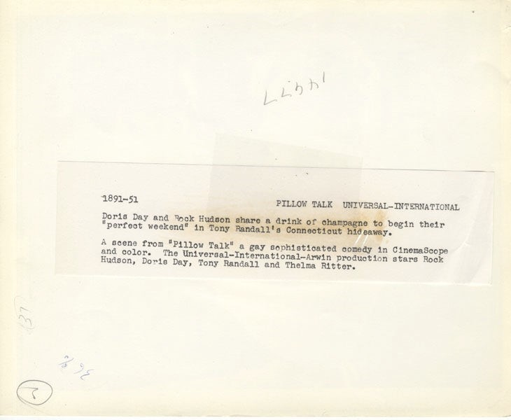 Pillow Talk Rock Hudson embracing a smiling Doris Day Original 8x10 Photo with Snipe 1959 VG Condition This item is an ORIGINAL 8x10 photo from the historic archives of Silver Screen Mementos. This original photograph was made in the actual year the film, television show or event was produced. The movie studios produced publicity photographs for distribution to the press, photo agencies and publicity departments to advertise the film/tv show or event. Very often original photos have press release information on the reverse of the photo - movie credits, description of the scene, event and people involved. This is a historic piece of cinema art and is being offered from one collector to another, no rights given or implied. Silver Screen are gradually releasing thousands of Original Photographs, Transparencies, Negatives, Lobby Cards, Posters, Magazines and other memorabilia from our historic archive.