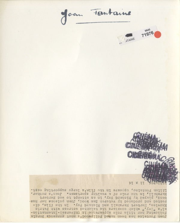 Joan Fontaine Ivy 1947 Alluring Femme Fatale Original 8x10 Silver Gelatin Photo Stamped with Snipe , gorgeous rar ephotograph in VG/Near Mint Condition This item is an ORIGINAL 8x10 photo from the historic archives of Silver Screen Mementos. This original photograph was made in the actual year the film, television show or event was produced. The movie studios produced publicity photographs for distribution to the press, photo agencies and publicity departments to advertise the film/tv show or event. Very often original photos have press release information on the reverse of the photo - movie credits, description of the scene, event and people involved. This is a historic piece of cinema art and is being offered from one collector to another, no rights given or implied. Silver Screen are gradually releasing thousands of Original Photographs, Transparencies, Negatives, Lobby Cards, Posters, Magazines and other memorabilia from our historic archive.