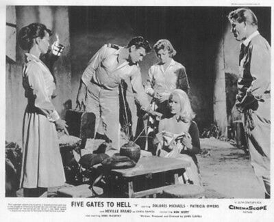 FIVE GATES TO HELL ORIGINAL BRITISH LOBBY CARD. NMINT CONDITION. 8X10 INCHES. DOLORES MICHAELS, PATRICIA OWENS: Silver Screen Mementos are pleased to be able to offer this authentic original lobby card measuring 8x10 inches. This lobby card is from Great Britain and was printed during the actual year the film was released in movie theaters. The lobby card (also known as Front of House/ FOH card in the UK) was created by the film studios to publicise the movie and was intended for display outside the movie theatre in special glass display boxes. THESE ARE NOT REPRODUCTIONS! You are looking at a truly original piece of cinema art, a genuine collector's item. We have a huge archive of over 250,000 original lobby cards, mostly from the 1930's to the 1980's. We will be releasing many more rare gems from our vast collection, which will include lobby cards, original photographs, movie stills, transparencies and slides.