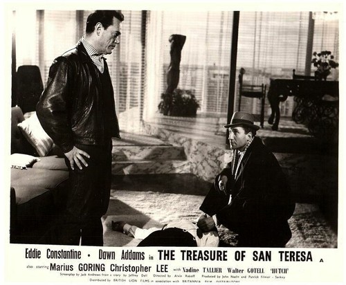 Treasure of San Teresa original lobby card Eddie Constantine Marius Goring. Silver Screen Mementos are pleased to be able to offer this authentic original lobby card measuring 8x10 inches. This lobby card is from Great Britain and was printed during the actual year the film was released in movie theaters. The lobby card (also known as Front of House/ FOH card in the UK) was created by the film studios to publicise the movie and was intended for display outside the movie theatre in special glass display boxes. THESE ARE NOT REPRODUCTIONS! You are looking at a truly original piece of cinema art, a genuine collector's item. We have a huge archive of over 250,000 original lobby cards, mostly from the 1930's to the 1980's. We will be releasing many more rare gems from our vast collection, which will include lobby cards, original photographs, movie stills, transparencies and slides.