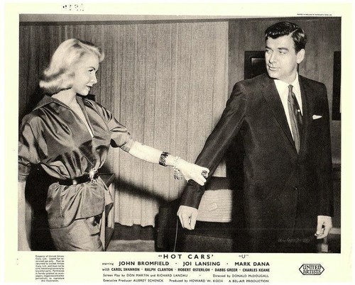 HOT CARS Original Lobby Card 1956 Joi Lansing Mark Dana John Bromfield Near Mint. Silver Screen Mementos are pleased to be able to offer this authentic original lobby card measuring 8x10 inches. This lobby card is from Great Britain and was printed during the actual year the film was released in movie theaters. The lobby card (also known as Front of House/ FOH card in the UK) was created by the film studios to publicise the movie and was intended for display outside the movie theatre in special glass display boxes. THESE ARE NOT REPRODUCTIONS! You are looking at a truly original piece of cinema art, a genuine collector's item. We have a huge archive of over 250,000 original lobby cards, mostly from the 1930's to the 1980's. We will be releasing many more rare gems from our vast collection, which will include lobby cards, original photographs, movie stills, transparencies and slides.