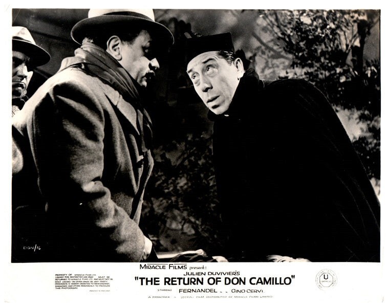 The Return of Don Camillo Original Lobby Card Fernandel Gino Cervi 1953 Good condition. Silver Screen Archives are pleased to be able to offer this authentic original lobby card measuring 8x10 inches. This lobby card is from Great Britain and was printed during the actual year the film was released in movie theaters. The lobby card (also known as Front of House/ FOH card in the UK) was created by the film studios to publicise the movie and was intended for display outside the movie theatre in special glass display boxes. THESE ARE NOT REPRODUCTIONS! You are looking at a truly original piece of cinema art, a genuine collector's item. We have a huge archive of over 250,000 original lobby cards, mostly from the 1930's to the 1980's. We will be releasing many more rare gems from our vast collection, which will include lobby cards, original photographs, movie stills, transparencies and slides. Listing and template services provided by inkFrog