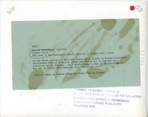 Sexton Blake Laurence Payne Roger Foss Original Thames TV Press Photo w snipe on double weight photo paper - This item is an ORIGINAL 8x10 photo from the historic archives of Silver Screen Mementos. This original photograph was made in the actual year the film, television show or event was produced. The movie studios produced publicity photographs for distribution to the press, photo agencies and publicity departments to advertise the film/tv show or event. Very often original photos have press release information on the reverse of the photo - movie credits, description of the scene, event and people involved. This is a historic piece of cinema art and is being offered from one collector to another, no rights given or implied. Listing and template services provided by inkFrog