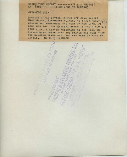 Mary Brian Silent Era Star with Idol Ganesa Original Vintage Photo with snipe on back dated 1930. Truly an amazing piece of original Hollywood history. This is an exceptionally rare original photograph being released from our historic archive in Very Fine Condition with no pin holes, tears or paper loss . This is an Original Photograph measuring approx 8x10 inches. Silver Screen Mementos has recently acquired another large archive of amazing and extremely rare original photographs from the Silent era through the early 'Talkies' and beyond. We will gradually be releasing some of these rare treasures, including some wonderful Original photographs of Louise Brooks, Fay Wray, Clara Bow, Charles Chaplin, Jean Arthur, Gary Cooper, Albert Einstein, Jean Harlow and Carole Lombard. This is a historic piece of cinema art and is being offered from one collector to another, no rights given or implied. Silver Screen Mementos are gradually releasing thousands of Original Photographs, Transparencies, Slides, Lobby Cards, Movie Posters, Magazines and other entertainment memorabilia from its historic archives. Listing and template services provided by inkFrog