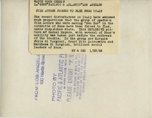 Carmel Meyers in Ben Hur Costume 1925 Original Press Photo taken with Italian Nobility escaping Rome , rarewith snipe. A truly wonderful image, a real collectors item!This is an exceptionally rare original photograph measuring 7x9 approx inches being released from our historic archive in Very Fine Condition (no pin holes, tears or paper loss) .This is an Original Photograph measuring approx 7x9 inches. Silver Screen Archives has recently acquired another large archive of amazing and extremely rare original photographs from the Silent era through the early'Talkies'and beyond. We will gradually be releasing some of these rare treasures, including some wonderful Original photographs of Louise Brooks, Fay Wray, Clara Bow, Charles Chaplin, Jean Arthur, Gary Cooper, Albert Einstein, Jean Harlow and Carole Lombard. This is a historic piece of cinema art and is being offered from one collector to another, no rights given or implied. Silver Screen Archives are gradually releasing thousands of Original Photographs, Transparencies, Slides, Lobby Cards, Movie Posters, Magazines and other entertainment memorabilia from its historic archives.Listing and template services provided by inkFrog