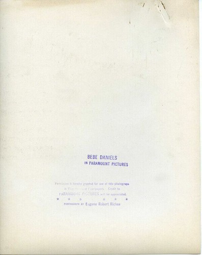 Bebe Daniels Historic Vintage Glamour Pose Original Stamped by Legendary Photographer Eugene Robert Richee Double Weight Silver Gelatin Photo. A truly wonderful image, a real collectors item! This is an exceptionally rare original photograph measuring 8x10 approx inches being released from our historic archive in VG Condition (slight paper clip mark on top border). This is an Original Photograph measuring approx 8x10 inches. Silver Screen Archives has recently acquired another large archive of amazing and extremely rare original photographs from the Silent era through the early 'Talkies' and beyond. We will gradually be releasing some of these rare treasures, including some wonderful Original photographs of Louise Brooks, Fay Wray, Clara Bow, Charles Chaplin, Jean Arthur, Gary Cooper, Albert Einstein, Jean Harlow and Carole Lombard. This is a historic piece of cinema art and is being offered from one collector to another, no rights given or implied. Silver Screen Archives are gradually releasing thousands of Original Photographs, Transparencies, Slides, Lobby Cards, Movie Posters, Magazines and other entertainment memorabilia from its historic archives. Listing and template services provided by inkFrog