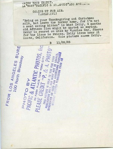 African Lion Cub Wildlife Nature Vintage Original Press Photograph 1925 with snipe measuring approx 7x9 inches This is an Original Photograph measuring approx 8x10 inches. Silver Screen Archives has recently acquired another large archive of amazing and extremely rare original photographs from the Silent era through the early 'Talkies' and beyond. We will gradually be releasing some of these rare treasures, including some wonderful Original photographs of Louise Brooks, Fay Wray, Clara Bow, Charles Chaplin, Jean Arthur, Gary Cooper, Albert Einstein, Jean Harlow and Carole Lombard. This is a historic piece of cinema art and is being offered from one collector to another, no rights given or implied. Silver Screen Archives are gradually releasing thousands of Original Photographs, Transparencies, Slides, Lobby Cards, Movie Posters, Magazines and other entertainment memorabilia from its historic archives. Powered by SixBit's eCommerce Solution Listing and template services provided by inkFrog