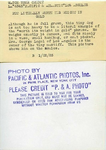 Toy Mastiff Dog Cute Vintage Original 7x5 Press Photograph on scales 1925 , great image in VG/Very Fine Condition This is an Original Photograph measuring approx 8x10 inches. Silver Screen Archives has recently acquired another large archive of amazing and extremely rare original photographs from the Silent era through the early 'Talkies' and beyond. We will gradually be releasing some of these rare treasures, including some wonderful Original photographs of Louise Brooks, Fay Wray, Clara Bow, Charles Chaplin, Jean Arthur, Gary Cooper, Albert Einstein, Jean Harlow and Carole Lombard. This is a historic piece of cinema art and is being offered from one collector to another, no rights given or implied. Silver Screen Archives are gradually releasing thousands of Original Photographs, Transparencies, Slides, Lobby Cards, Movie Posters, Magazines and other entertainment memorabilia from its historic archives. Powered by SixBit's eCommerce Solution Listing and template services provided by inkFrog