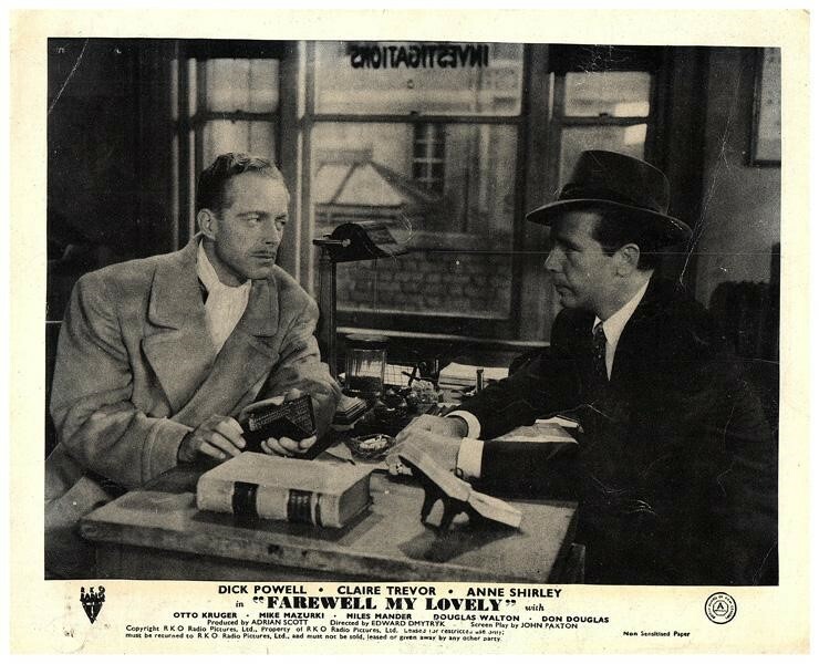 Farewell My Lovely /Murder My Sweet Original Lobby Card Dick Powell Philip Marlowe 1944 classic in Good Condition Silver Screen Archives are pleased to be able to offer this authentic original Lobby Card measuring 8x10 inches. This lobby card is from Great Britain and was printed during the actual year the film was released in movie theaters. The lobby card (also known as Front of House/ FOH card in the UK) was created by the film studios to publicize the movie and was intended for display outside the movie theatre in special glass display boxes. These are NOT reproductions! You are looking at a truly original piece of cinema art, a genuine collector's item. We have a huge archive of over 250,000 original lobby cards, mostly from the 1930's to the 1980's. We will be releasing many more rare gems from our vast collection, which will include lobby cards, original photographs, movie stills, magazines, brochures negatives, transparencies, slides and other collectible items of movie memorabilia. Powered by SixBit's eCommerce Solution Listing and template services provided by inkFrog