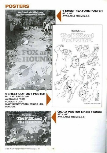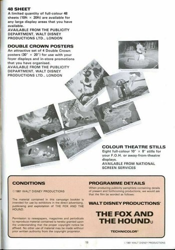 The Fox and the Hound Original British Campaign Press Book Walt Disney 20 pages poster art, exhibitor info, photos, articles etc. This is an original souvenir film brochure issued the year of the film's release. These brochures are highly collectible and feature many pages of color and b/w photographs, behind the scenes, articles, interviews, cast and crew features and portraits. Film Brochures typically measure approximately 9x11 inches. This original item is in VG/Near Mint Condition.Silver Screen Archives are gradually releasing thousands of original photographs, transparencies, slides,negatives, Lobby Cards, Movie Posters, magazines, books and other collectors items from our historic archive. Powered by SixBit's eCommerce Solution Listing and template services provided by inkFrog