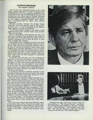 The Valachi Papers Original Film Brochure Charles Bronson 28 pages photos 1972 This is an original souvenir film brochure issued the year of the film's release. These brochures are highly collectible and feature many pages of color and b/w photographs, behind the scenes, articles, interviews, cast and crew features and portraits. Film Brochures typically measure approximately 9x11 inches. This original item is in VG/Near Mint Condition.Silver Screen Archives are gradually releasing thousands of original photographs, transparencies, slides,negatives, Lobby Cards, Movie Posters, magazines, books and other collectors items from our historic archive. Powered by SixBit's eCommerce Solution Listing and template services provided by inkFrog