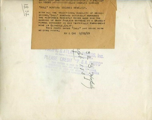 Bull Montana Italian American Wrestler Vintage Original Wedding Photograph 1929 with original snipe This is an Original Photograph measuring approx 8x10 inches. Silver Screen Archives has recently acquired another large archive of amazing and extremely rare original photographs from the Silent era through the early 'Talkies' and beyond. We will gradually be releasing some of these rare treasures, including some wonderful Original photographs of Louise Brooks, Fay Wray, Clara Bow, Charles Chaplin, Jean Arthur, Gary Cooper, Albert Einstein, Jean Harlow and Carole Lombard. This is a historic piece of cinema art and is being offered from one collector to another, no rights given or implied. Silver Screen Archives are gradually releasing thousands of Original Photographs, Transparencies, Slides, Lobby Cards, Movie Posters, Magazines and other entertainment memorabilia from its historic archives. Powered by SixBit's eCommerce Solution Listing and template services provided by inkFrog