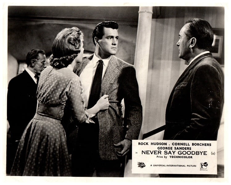 Never Say Goodbye Original Lobby Card Rock Hudson Cornell Borchers George Sanders Shelley Fabares 1956 VG condition Silver Screen Archives are pleased to be able to offer this authentic original Lobby Card measuring 8x10 inches. This lobby card is from Great Britain and was printed during the actual year the film was released in movie theaters. The lobby card (also known as Front of House/ FOH card in the UK) was created by the film studios to publicize the movie and was intended for display outside the movie theatre in special glass display boxes. These are NOT reproductions! You are looking at a truly original piece of cinema art, a genuine collector's item. We have a huge archive of over 250,000 original lobby cards, mostly from the 1930's to the 1980's. We will be releasing many more rare gems from our vast collection, which will include lobby cards, original photographs, movie stills, magazines, brochures negatives, transparencies, slides and other collectible items of movie memorabilia. Powered by SixBit's eCommerce Solution Listing and template services provided by inkFrog