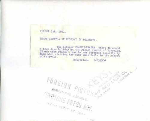 Frank Sinatra fans South of France 1971 at club Original Press Photo with snipe VG/Near Mint Includes free TOP LOADER Protective archival photo holder. This item is an ORIGINAL 8x10 photo from the historic archives of Silver Screen Mementos. This photo also includes a protective clear rigid archival TOP LOADER photo holder. This original photograph was made in the actual year the film, television show or event was produced. The movie studios produced publicity photographs for distribution to the press, photo agencies and publicity departments to advertise the film/tv show or event. Very often original photos have press release information on the reverse of the photo - movie credits, description of the scene, event and people involved. This is a historic piece of cinema art and is being offered from one collector to another, no rights given or implied. Silver Screen are gradually releasing thousands of Original Photographs, Transparencies, Negatives, Lobby Cards, Posters, Magazines and other memorabilia from our historic archive. Powered by SixBit's eCommerce Solution Listing and template services provided by inkFrog
