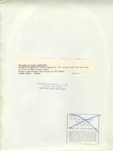 Susan Hampshire Gorgeous Forsythe Saga era Vintage Oversized 10x12 Stamped Photo with snipe on back in VG/Near Mint Condition This item is a Vintage Original Oversized Silver Gelatin photograph from the historic archives of Silver Screen Mementos. This photograph also includes a protective clear rigid archival TOP LOADER photo holder. We have a huge collection of original vintage oversized photographs that were produced by the photographer or photo agency with most having the photographer/agency stamp on the back and many with snipe detailing information about the shoot or subject. These are extremely rare collectors items and will be shipped securely in protective archival top loader holder and strong packaging to ensure safe delivery. This is a historic piece of photographic art and is being offered from one collector to another, no rights given or implied. Silver Screen are gradually releasing thousands of Original Photographs, Transparencies, Negatives, Lobby Cards, Posters, Magazines and other memorabilia from our historic archive. Powered by SixBit's eCommerce Solution Listing and template services provided by inkFrog