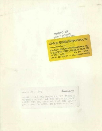 Donna Mills Michelle Lee Knots Landing stars 1991 Original Stamped Photo This item is an ORIGINAL 8x10 photo from the historic archives of Silver Screen Mementos. This original photograph was made in the actual year the film, television show or event was produced. The movie studios produced publicity photographs for distribution to the press, photo agencies and publicity departments to advertise the film/tv show or event. Very often original photos have press release information on the reverse of the photo - movie credits, description of the scene, event and people involved. This is a historic piece of cinema art and is being offered from one collector to another, no rights given or implied. Silver Screen are gradually releasing thousands of Original Photographs, Transparencies, Negatives, Lobby Cards, Posters, Magazines and other memorabilia from our historic archive. Powered by SixBit's eCommerce Solution Listing and template services provided by inkFrog