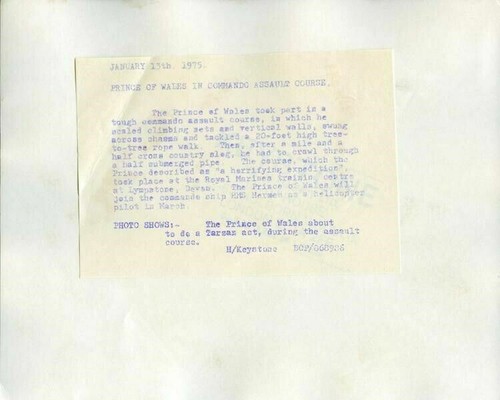 Prince Charles Royal Marines Assault Course 1975 Original Stamped 8x10 Photo VG/Near Mint This item is an ORIGINAL 8x10 photo from the historic archives of Silver Screen Mementos. This original photograph was made in the actual year the film, television show or event was produced. The movie studios produced publicity photographs for distribution to the press, photo agencies and publicity departments to advertise the film/tv show or event. Very often original photos have press release information on the reverse of the photo - movie credits, description of the scene, event and people involved. This is a historic piece of cinema art and is being offered from one collector to another, no rights given or implied. Silver Screen are gradually releasing thousands of Original Photographs, Transparencies, Negatives, Lobby Cards, Posters, Magazines and other memorabilia from our historic archive. Powered by SixBit's eCommerce Solution Listing and template services provided by inkFrog