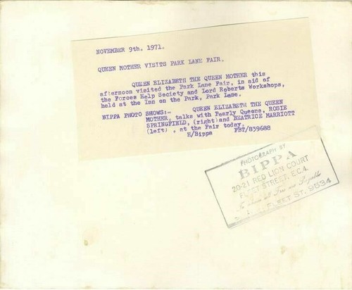 H.M. Queen Elizabeth Mother 1971 Rosie Springfield Beatrice Marriott 8x10 Photo Near Mint This item is an ORIGINAL 8x10 photo from the historic archives of Silver Screen Mementos. This original photograph was made in the actual year the film, television show or event was produced. The movie studios produced publicity photographs for distribution to the press, photo agencies and publicity departments to advertise the film/tv show or event. Very often original photos have press release information on the reverse of the photo - movie credits, description of the scene, event and people involved. This is a historic piece of cinema art and is being offered from one collector to another, no rights given or implied. Silver Screen are gradually releasing thousands of Original Photographs, Transparencies, Negatives, Lobby Cards, Posters, Magazines and other memorabilia from our historic archive. Powered by SixBit's eCommerce Solution Listing and template services provided by inkFrog